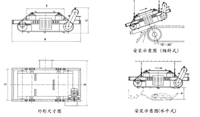 總體尺寸小,可稱為輕型永磁帶式除鐵器,長(zhǎng)度、高度分別是C型的:70%、86%。